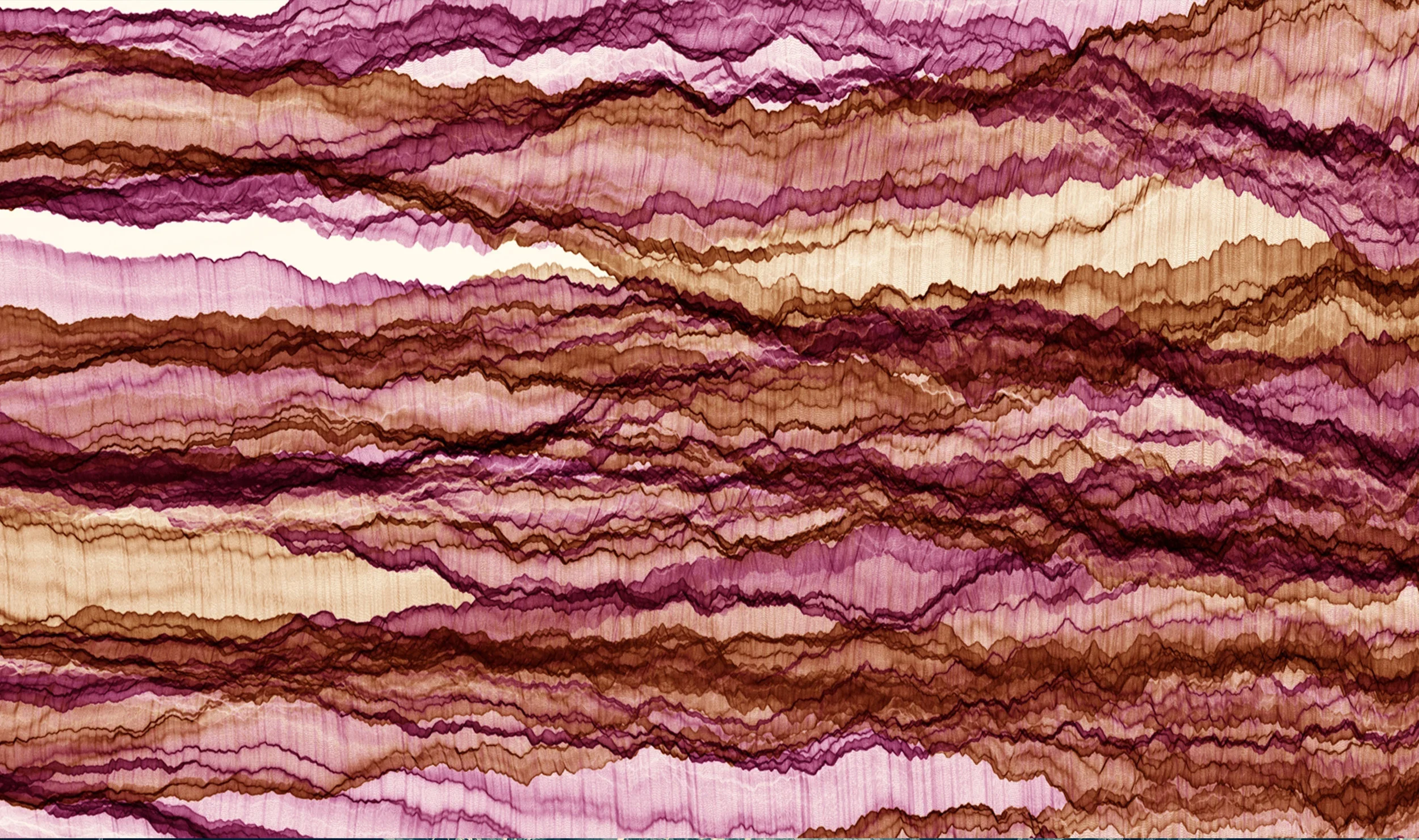 Over an hour, the lines of geological forms and rippling water are drawn and change in response to each year’s variation in temperature. Motion, frequency and speed tell the story of these predictive datasets, creating the abstract patterns of this imagined world.