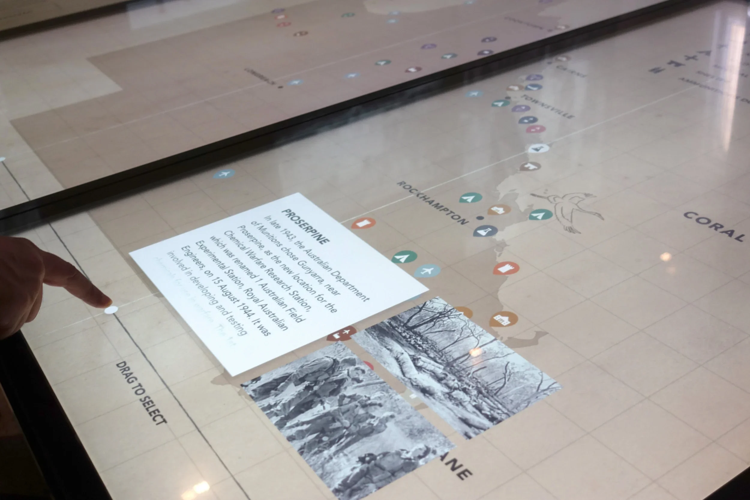 Visitors in the galleries can explore interactive flipbooks, animations, personal interviews, timelines, maps and 3D objects scanned from the State Library of Queensland’s archives.