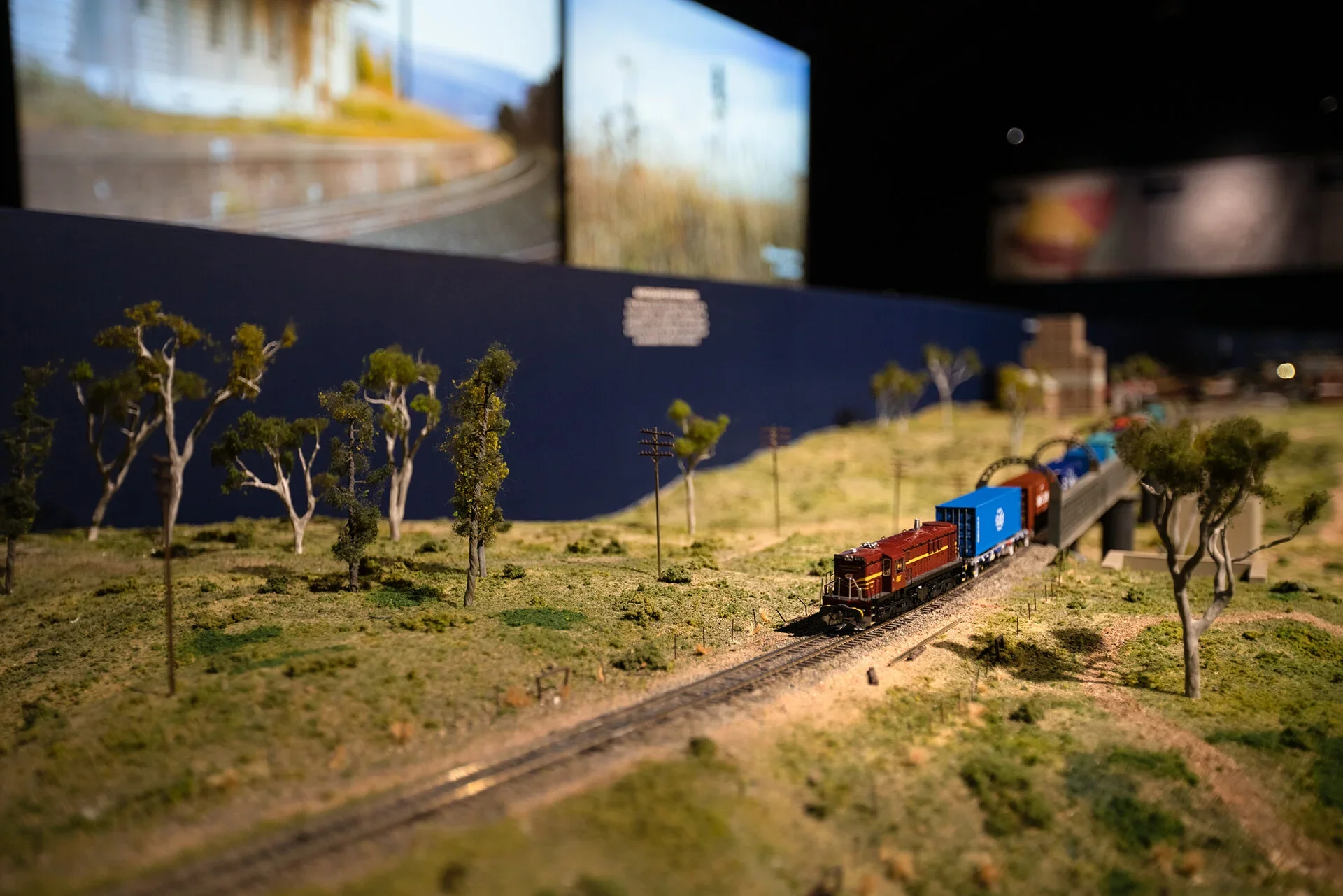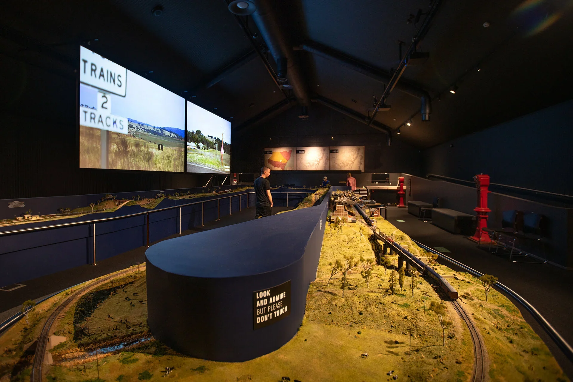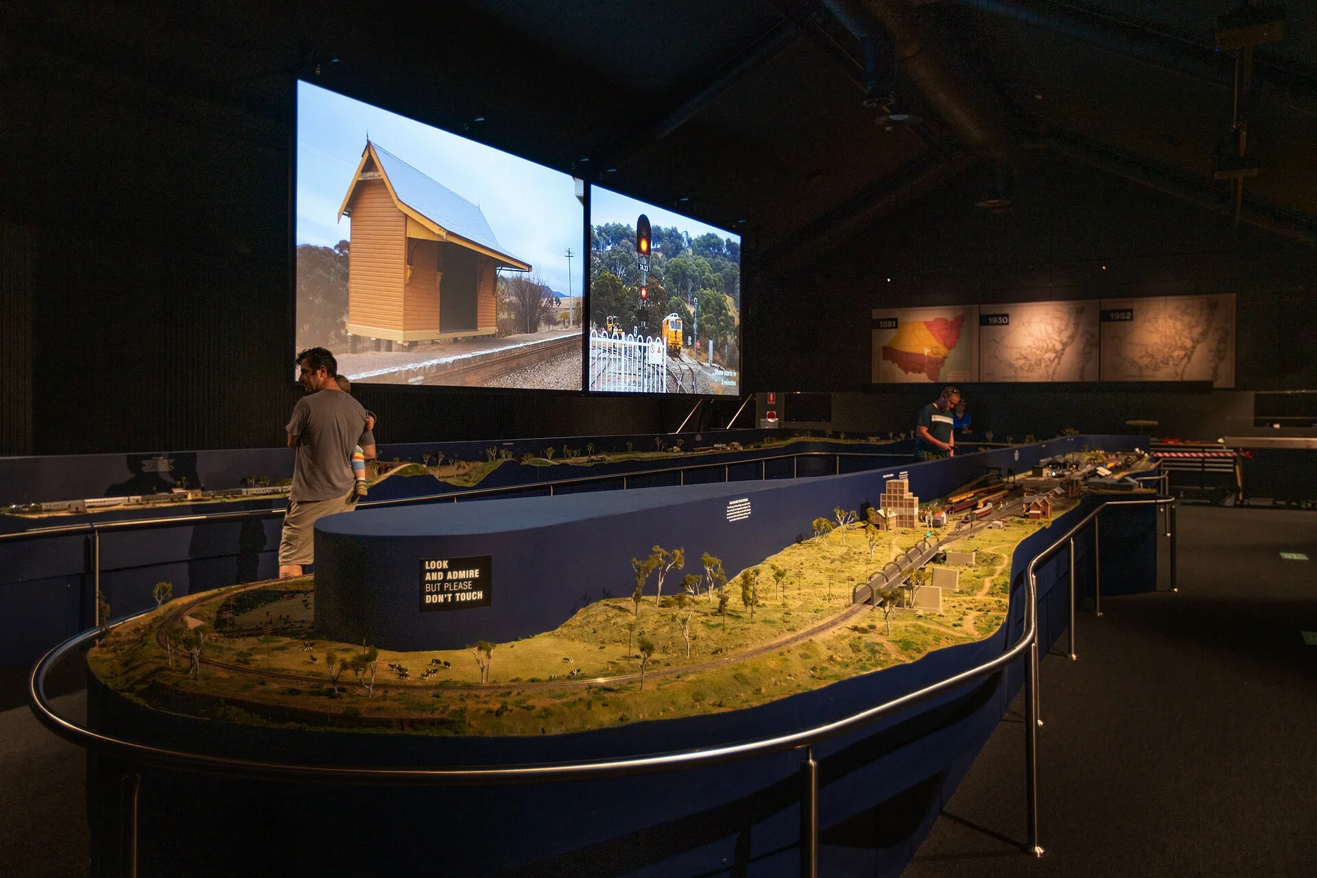 The centrepiece of the museum is a two-screen projected video illustrating the journey from Bathurst to Tarana. The show timing is integrated with the exhibition lighting and the model train set in the centre of the room. While the show isn’t running, a 10-minute idle state with picturesque footage of the Bathurst countryside creates a peaceful counterpoint to the show state.