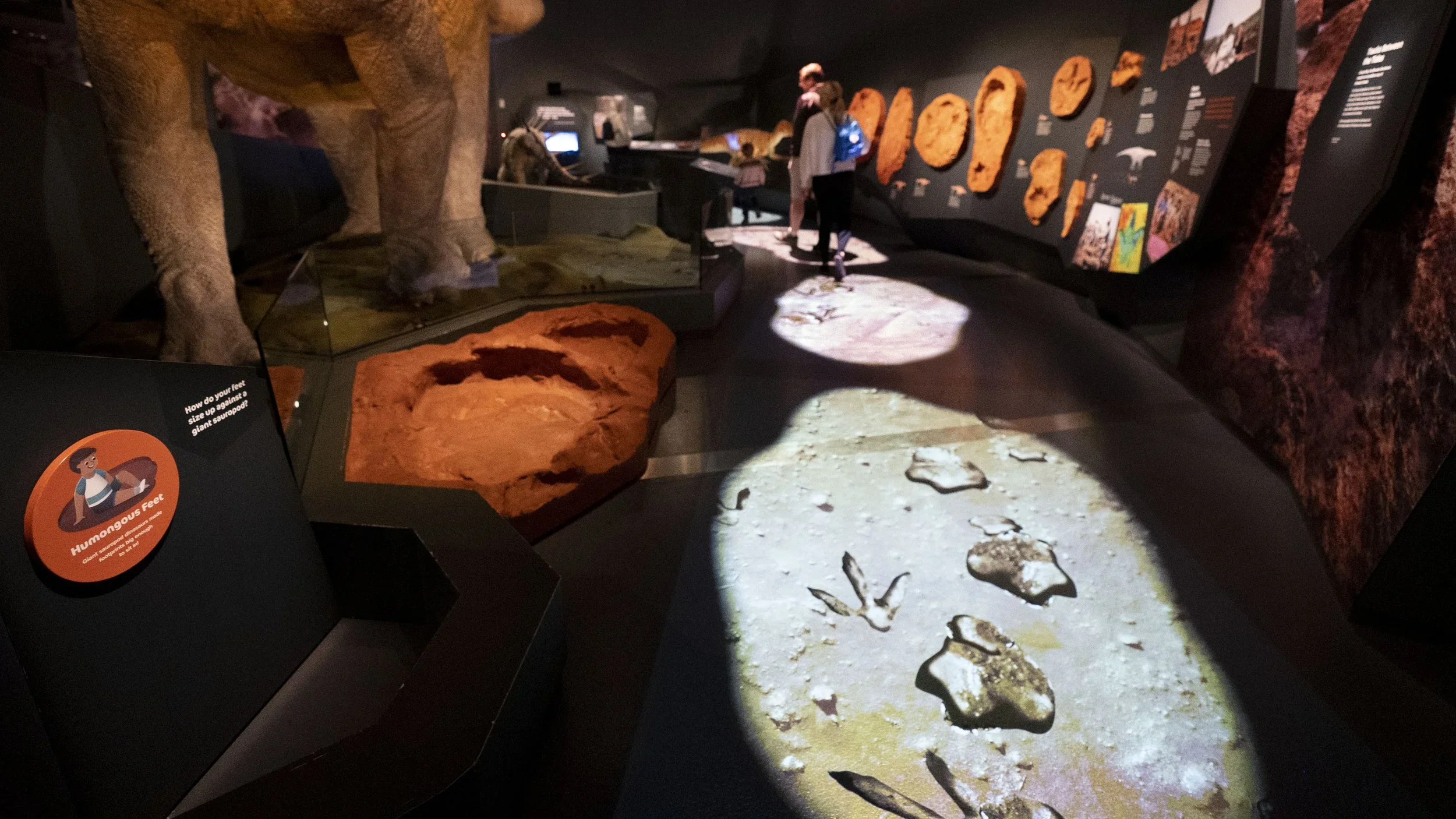 As part of the suite of multimedia our team developed ‘Dino Trackways’, a camera-tracking interactive where visitors walk through muddy projected pools and see dinosaur footprints following their movements, periodically washed away by flowing water.