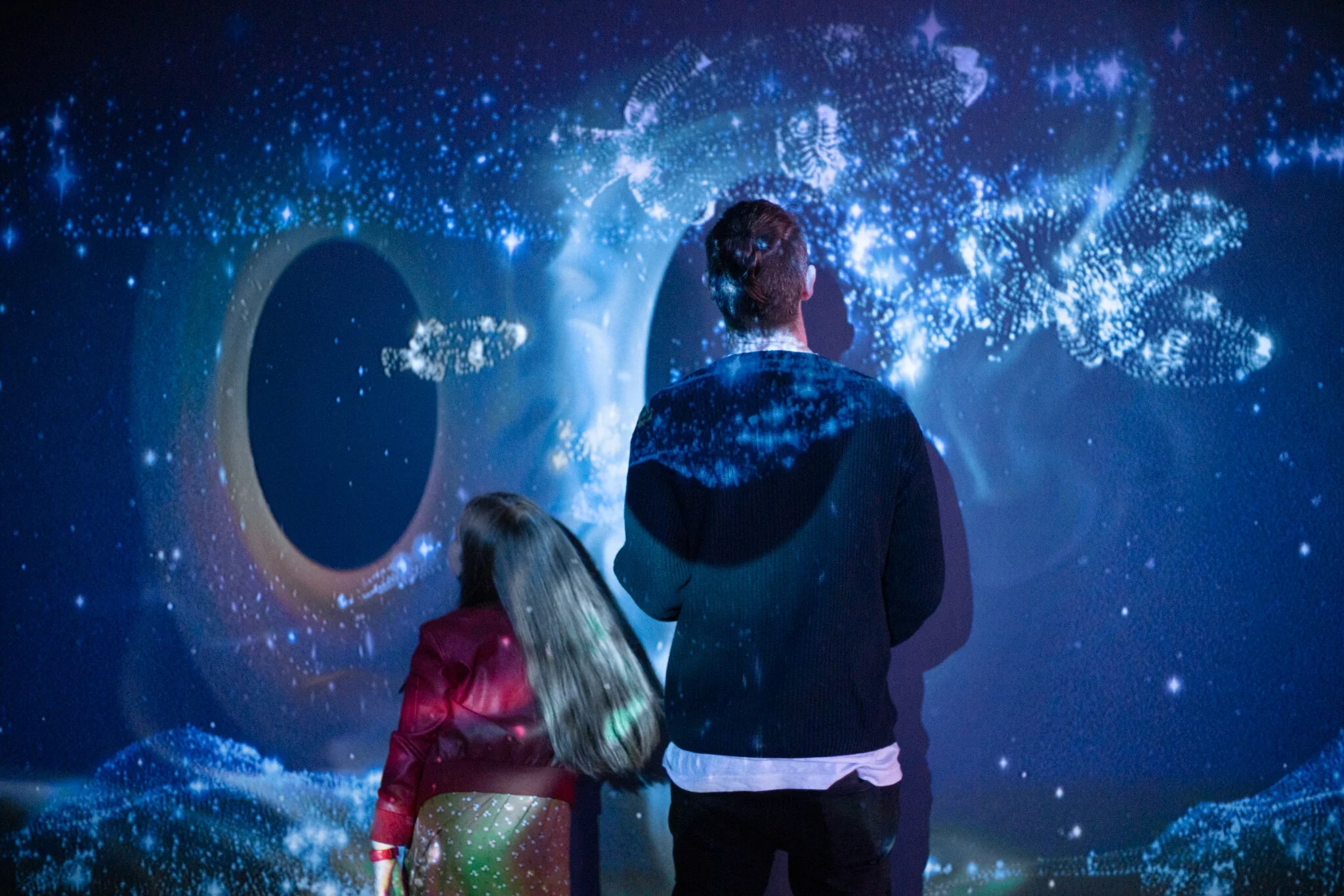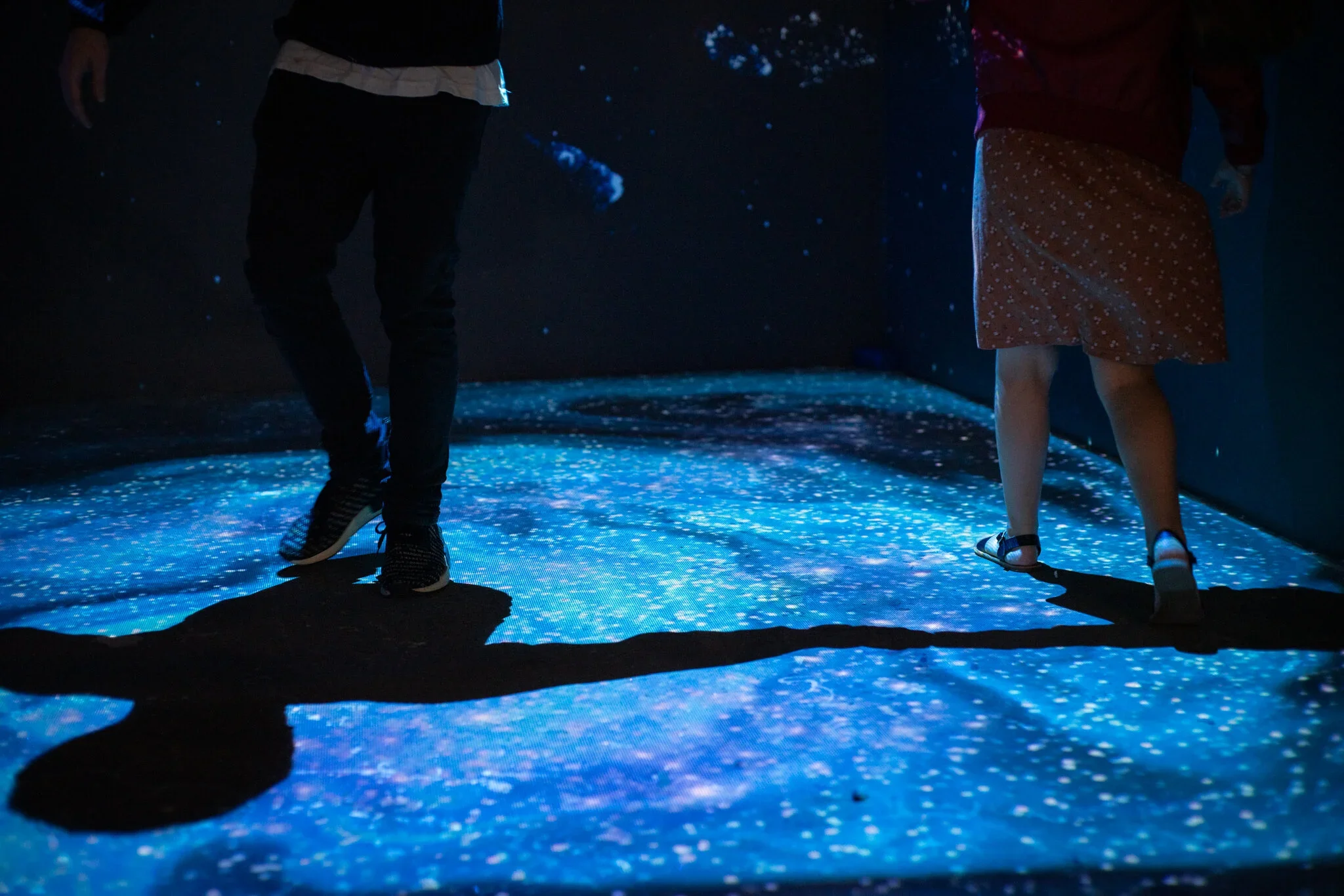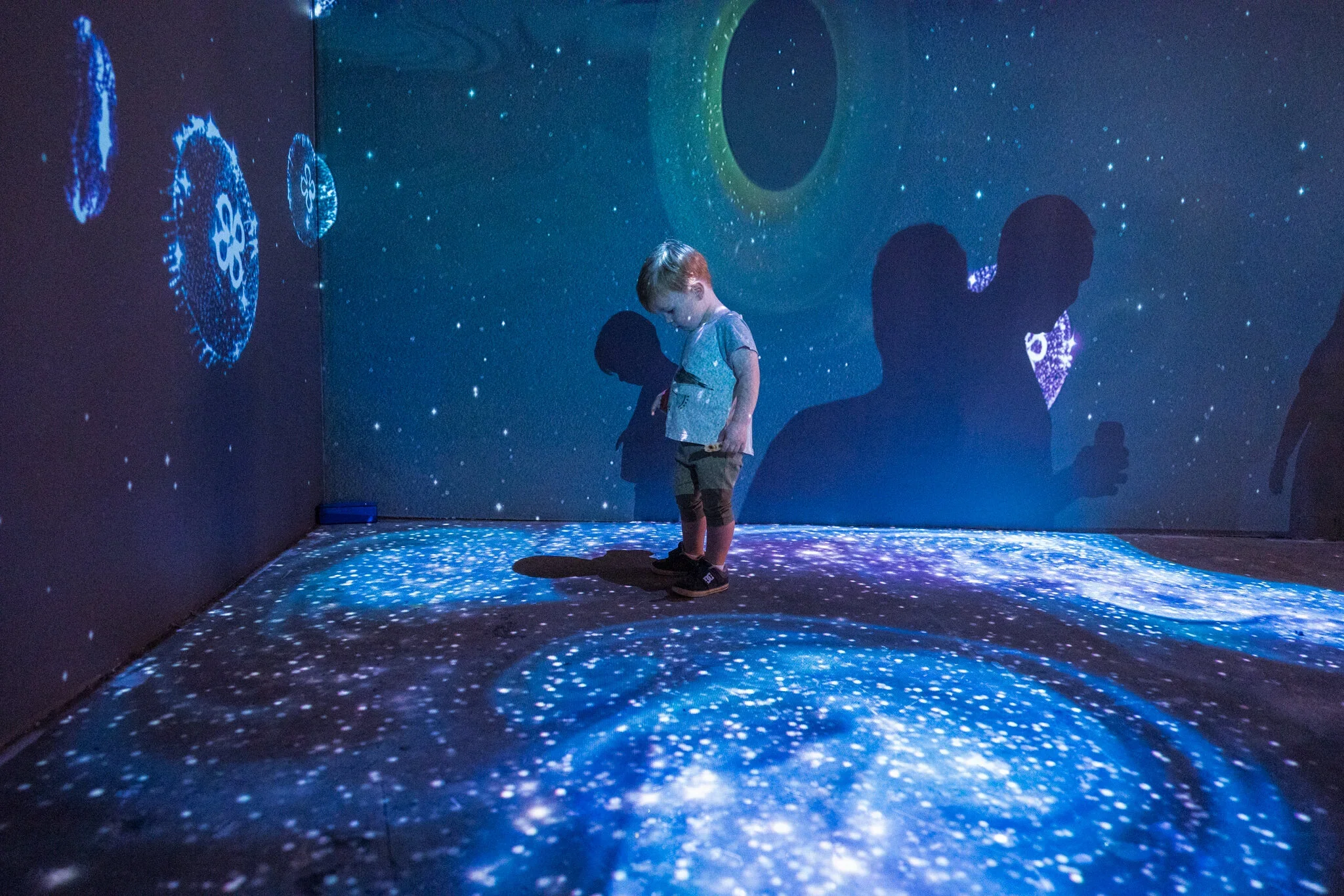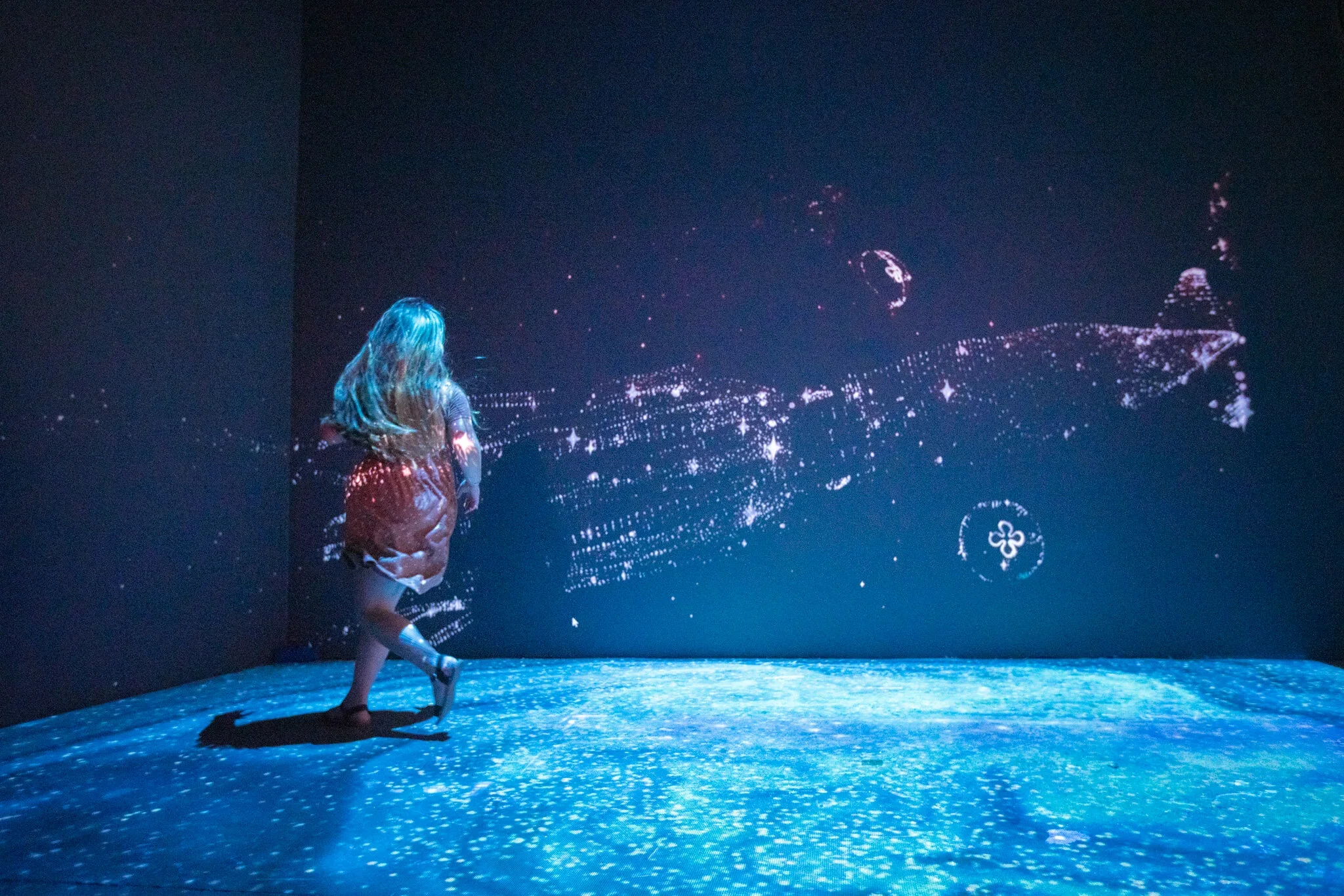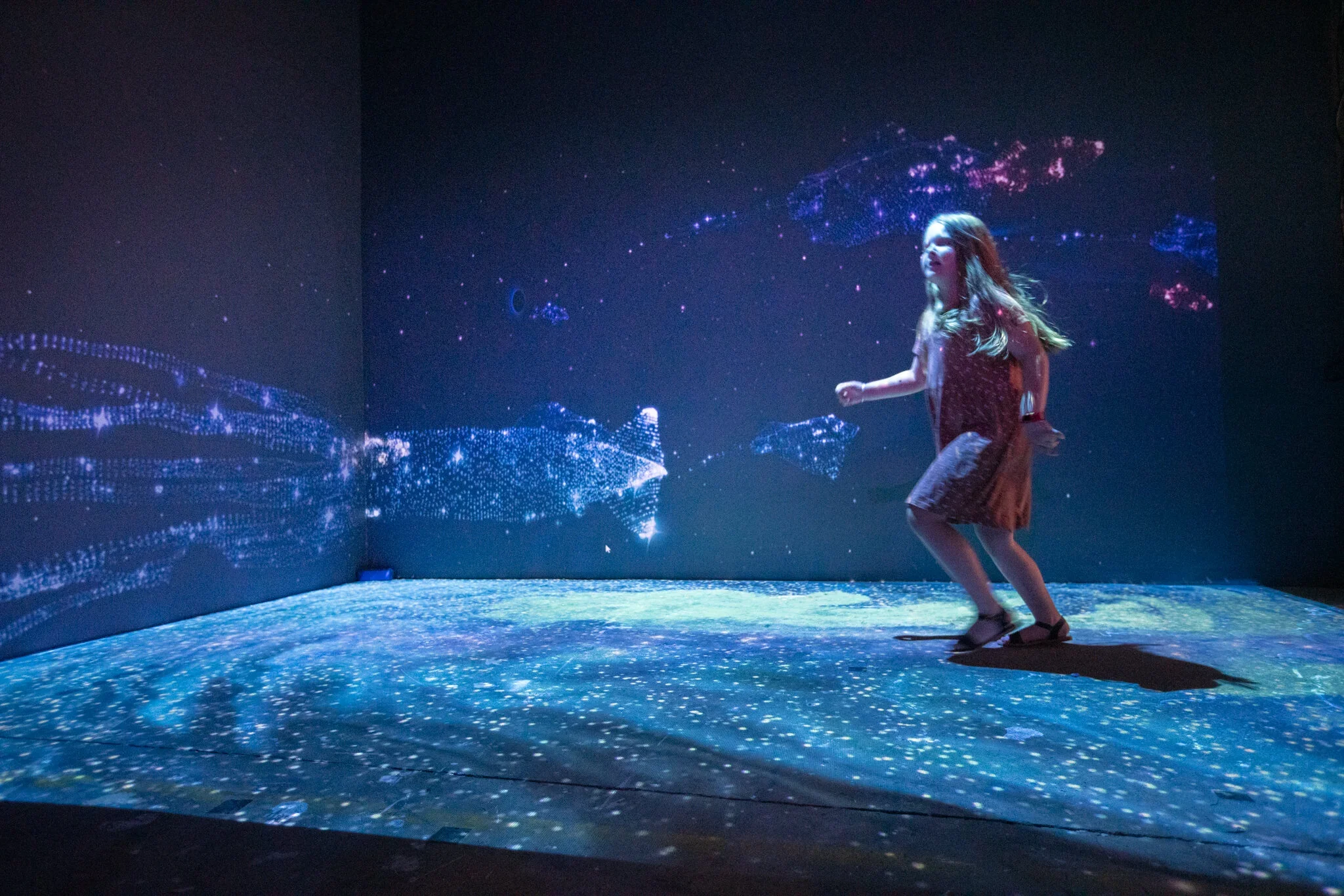 Deep Space is an intergalactic immersive installation filled with animated marine creatures, interactive wormholes and constellations. As visitors move through the space, swirling galaxies form under their feet and coloured wormholes appear on the walls. These wormholes become the gateway for 3D whales, jellyfish, stingrays, schools of fish and giant squid made of stars that shift in colour and swim across the walls.