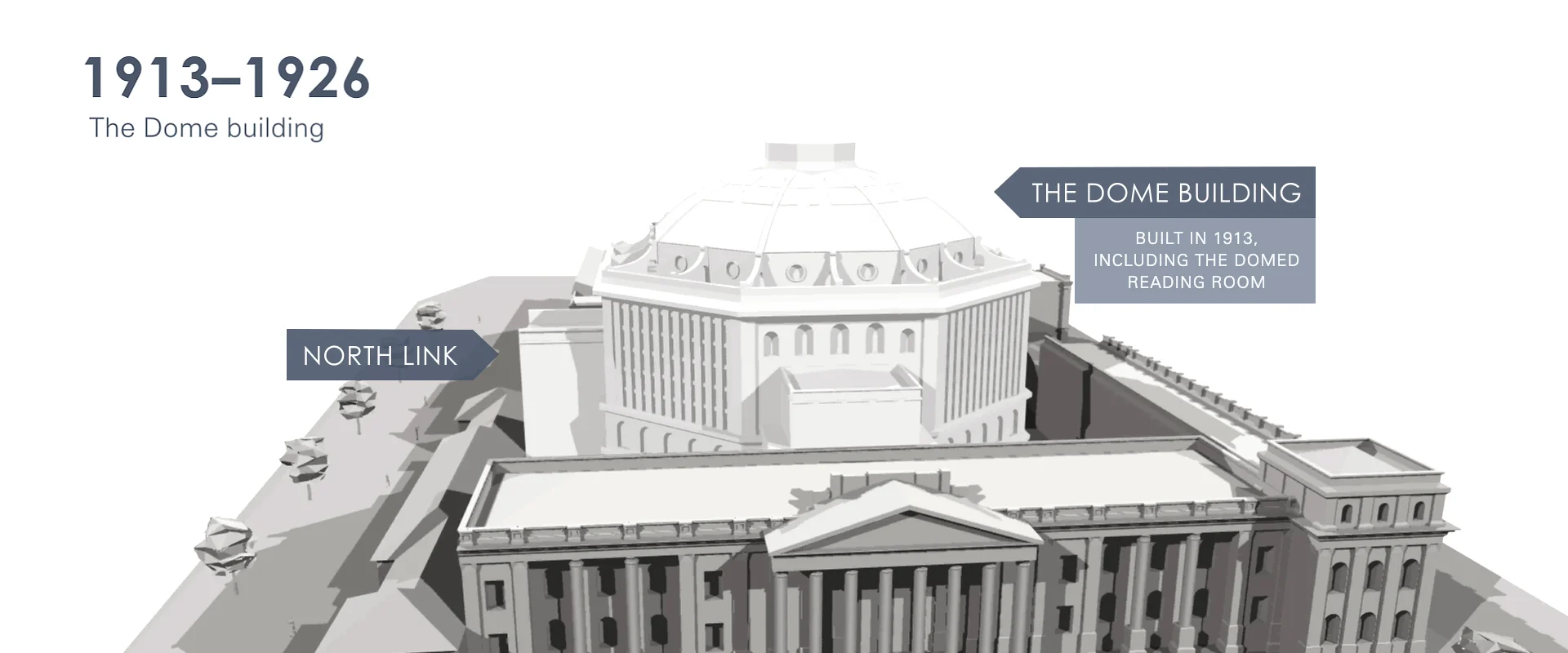 Using site plans and historical photographs, a series of 3D models of the State Library of Victoria were constructed and orbited in VectorWorks, then composited in After Effects to create a single animation illustrating the growth of the library over time.