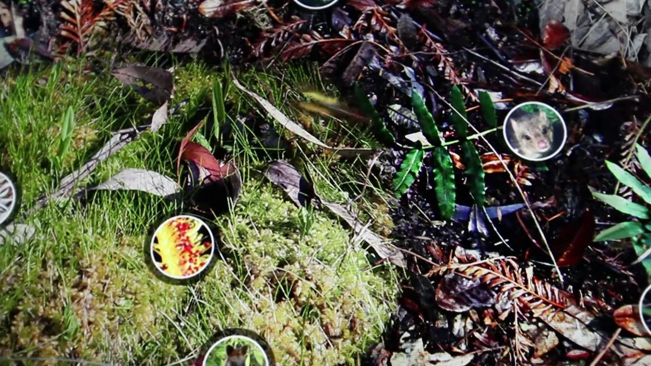 Accompanying the video installation are two multitouch interfaces that present detailed information about the tracks and trails that snake through this region and the plants and animals that belong in this place.