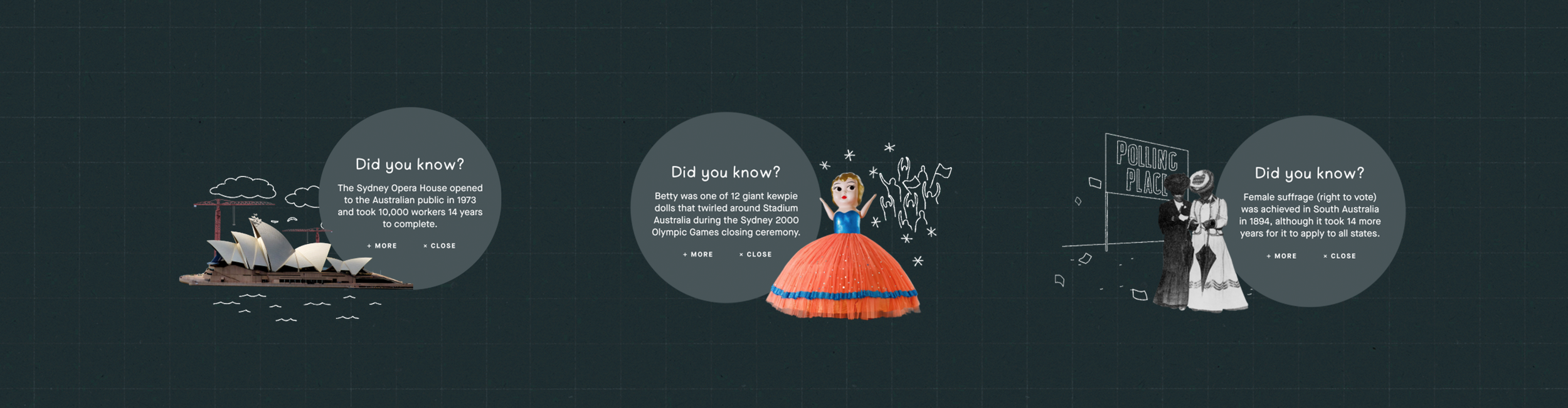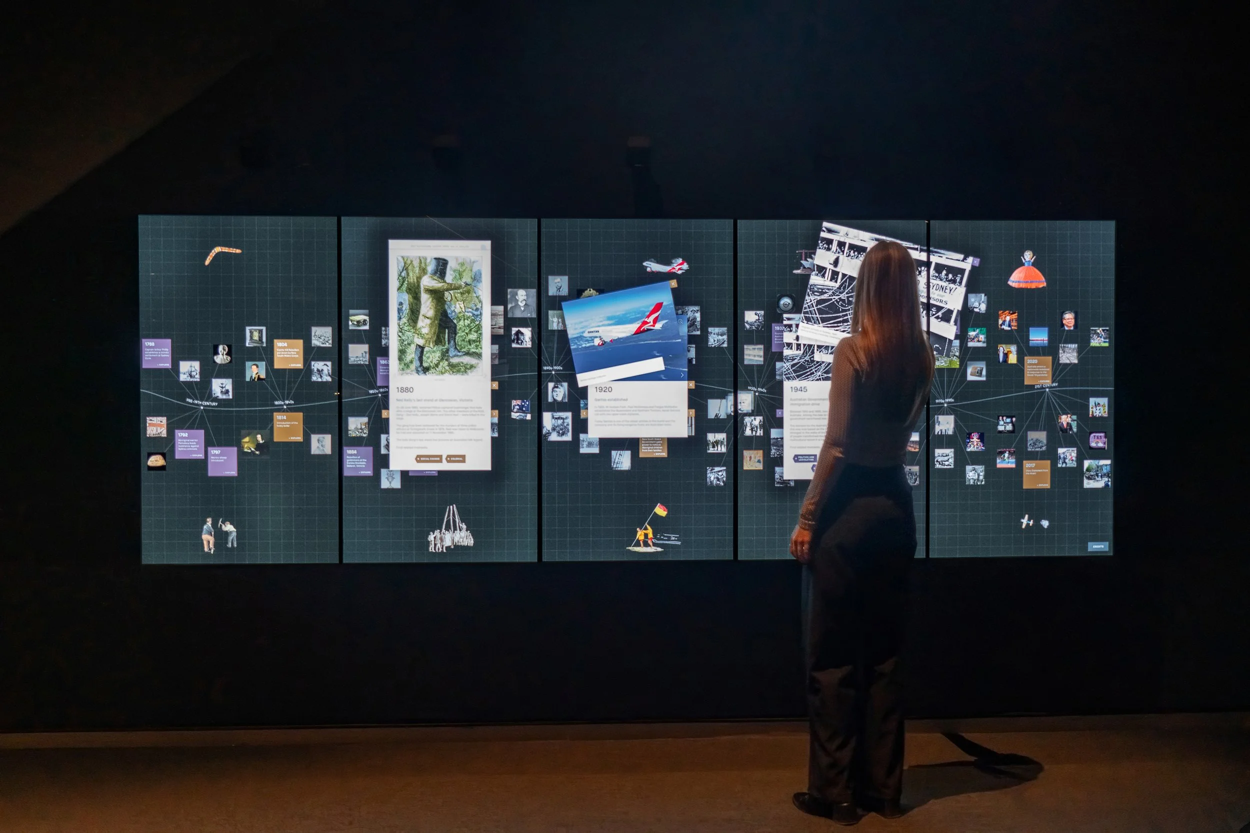 Visitors can explore a fluid timeline of pivotal landmarks in Australian history, supported by a series of interactive animations and sound effects. Each landmark is described and visually illustrated through archival imagery and objects held within the Museum's extensive collection. Networks of related landmarks can be revealed as dynamic visualisations to assist visitors in navigating through the content.