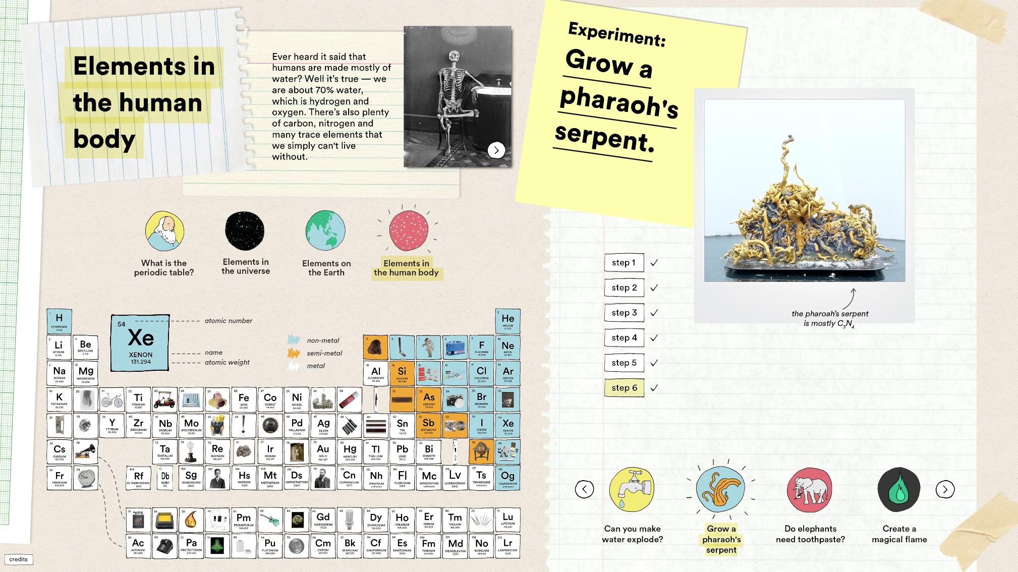 Based on a fun interpretation of the periodic table, visitors are able to explore elements and make fun experiments on a multi-user touchwall.
