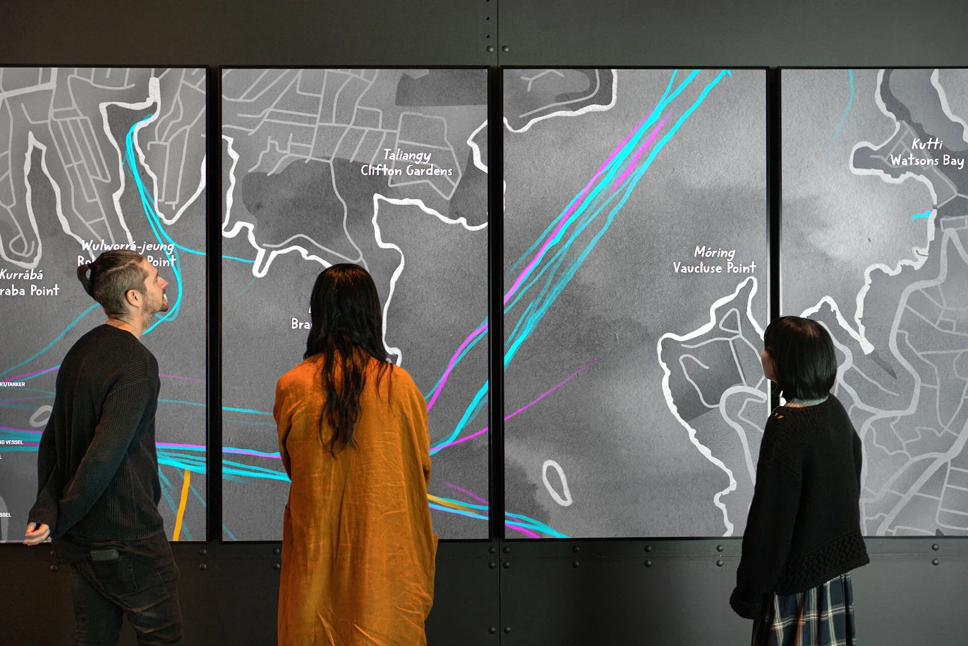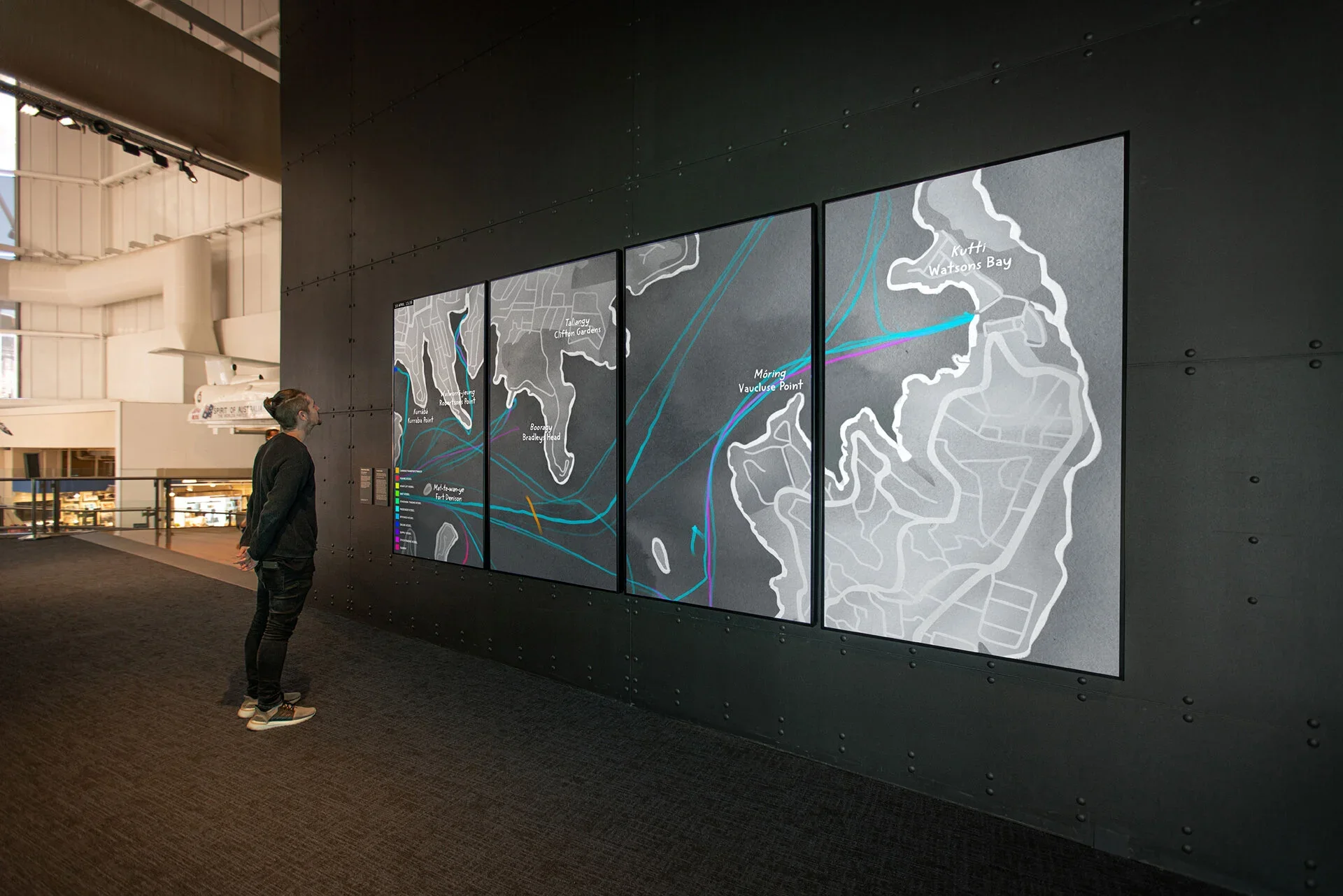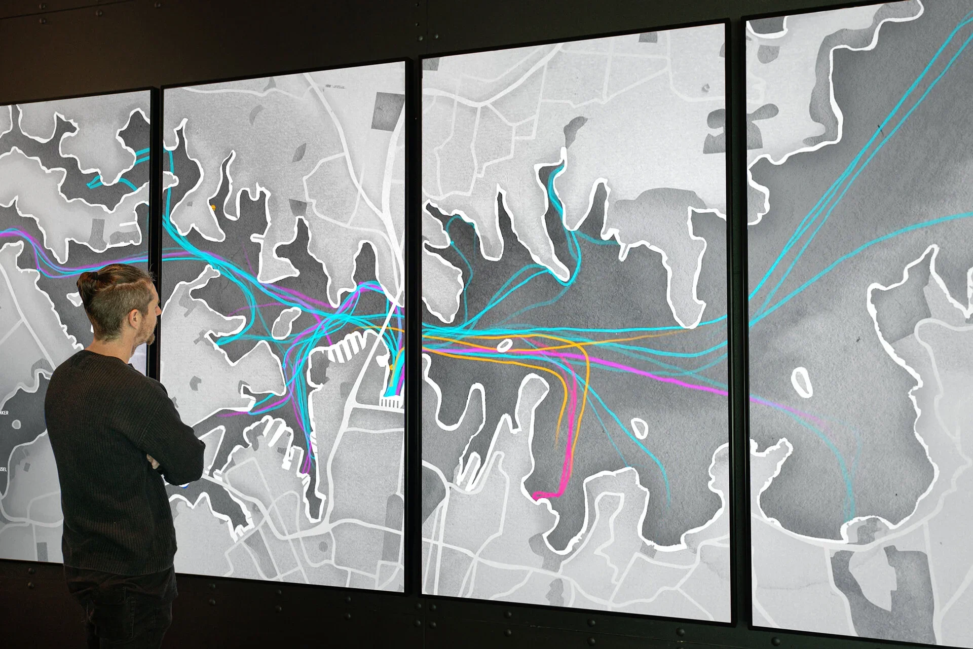 This four-screen video artwork converts marine traffic vessel data into an animated watercolour of Sydney Harbour. Using a year’s worth of AIS data, we transformed each vessel’s movement into watercolour trails and created a timelapse that shows the dynamic changes of the Harbour over 365 days.