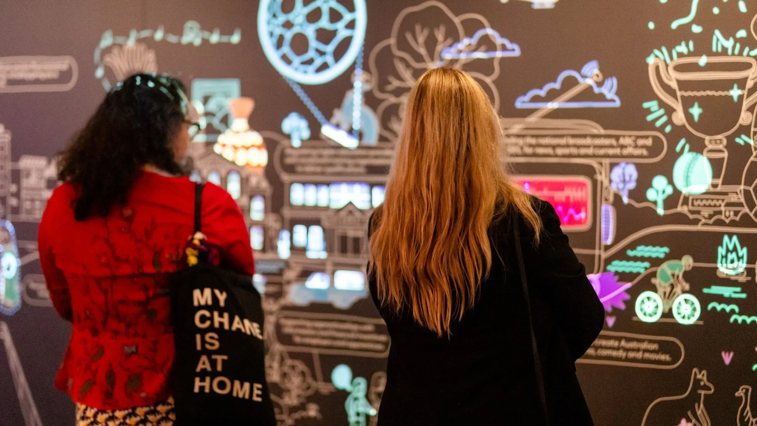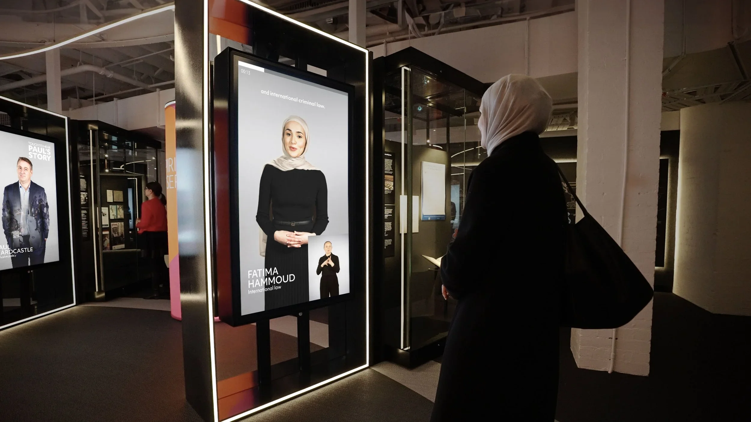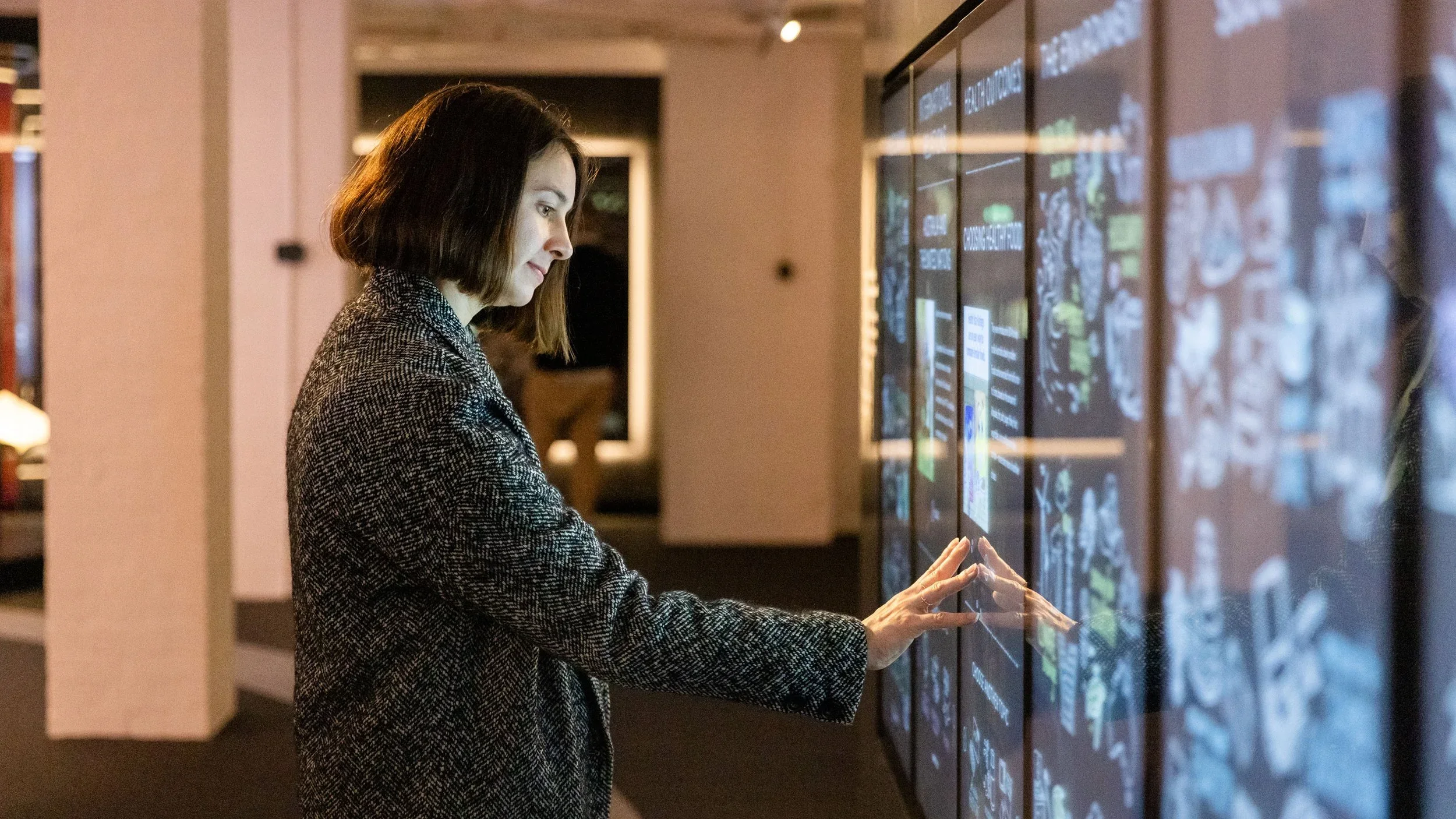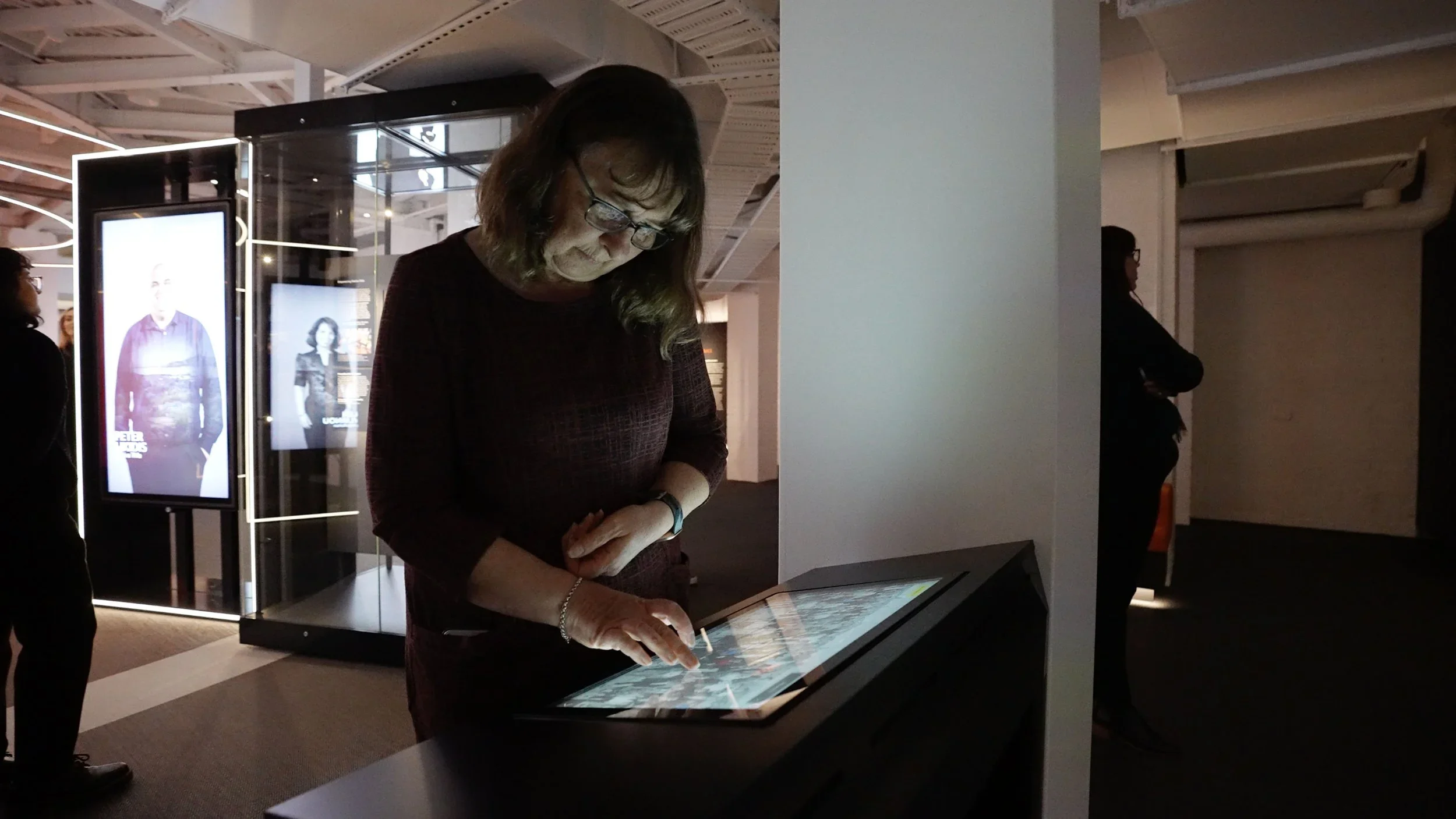 Surrounding the exhibition are 12 large personal story touchscreens triggered by motion sensors, a seven-screen touchwall with hand-drawn animations and an eight-metre capacitive touchwall that comes to life with projected animations.