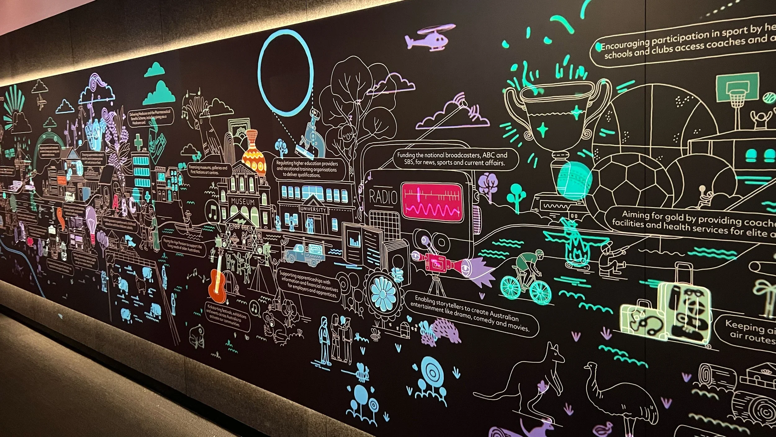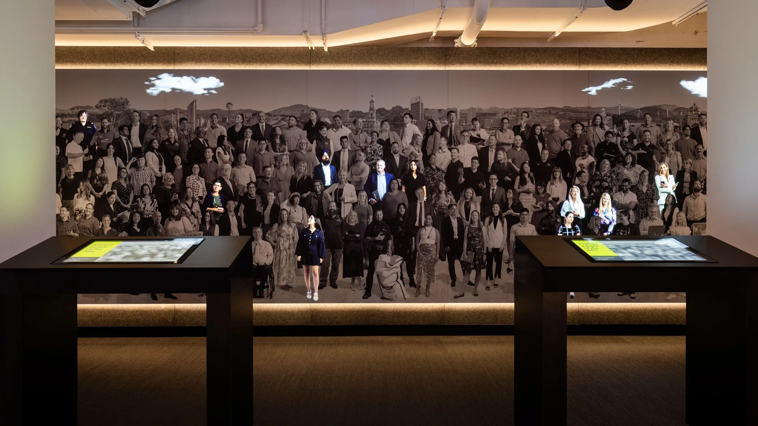 Our team also developed a large photographic mural, featuring 200 former and current APS employees from around Australia. This mural has been integrated with projected animations, and can be explored via two touchscreen consoles in front of the installation.