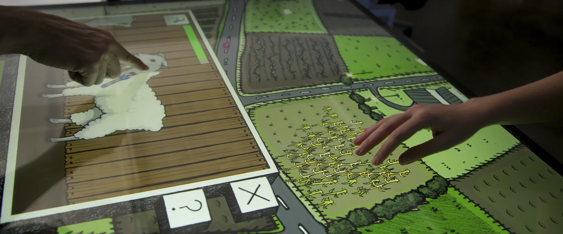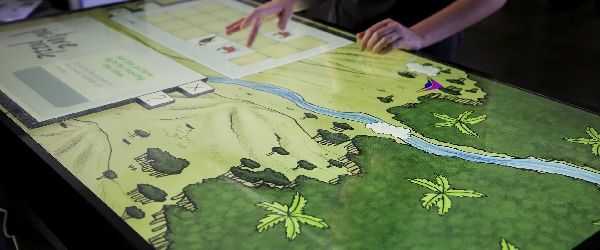Visitors can play the different single-user games available, or explore the multi-user activities that are hidden throughout the landscape. Finding animals, revealing fossils in the sand, changing the weather and flinging coconuts are just a few of the hidden interactions this table has to offer.