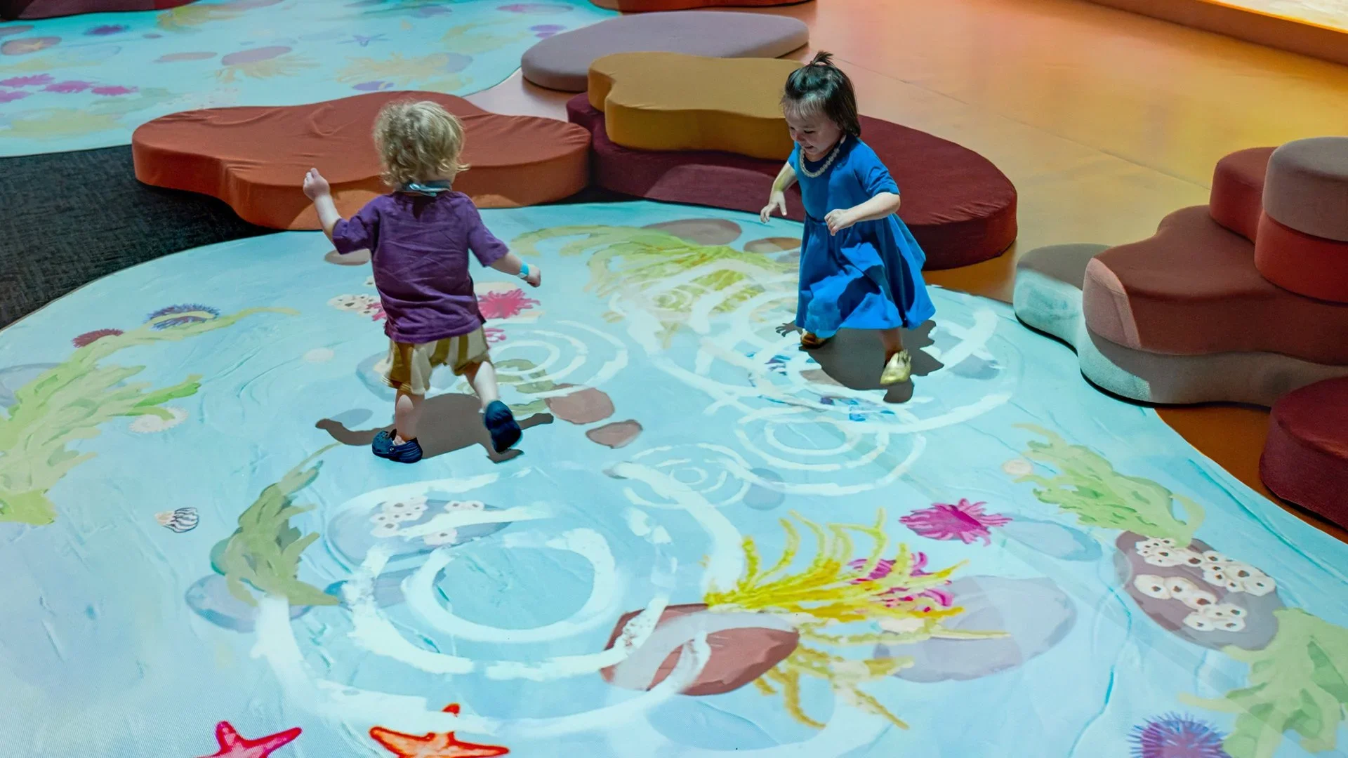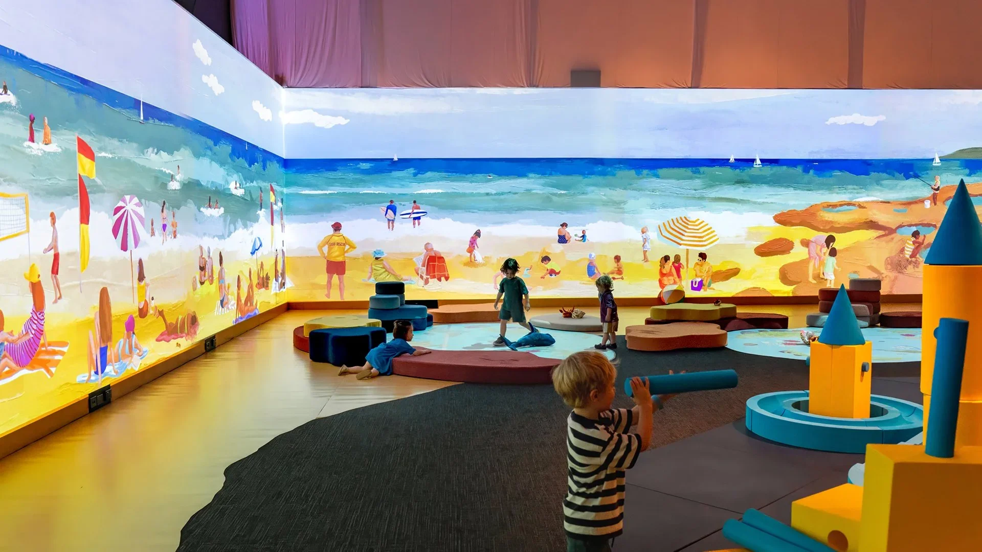 Lightwell worked with the Australian National Maritime Museum to develop a suite of multimedia for their Summer Program exhibition, The Beach. A 30-metre animation projected on two walls depicts a bustling beach scene, with crashing waves, boats bobbing on the horizon, people splashing in the water, and numerous ‘surprise’ moments, such as a seagull stealing chips. As visitors walk and run through a series of interactive rockpools on the floor, painterly ripples appear under their feet. All illustrations and animations were produced in-house by our team.