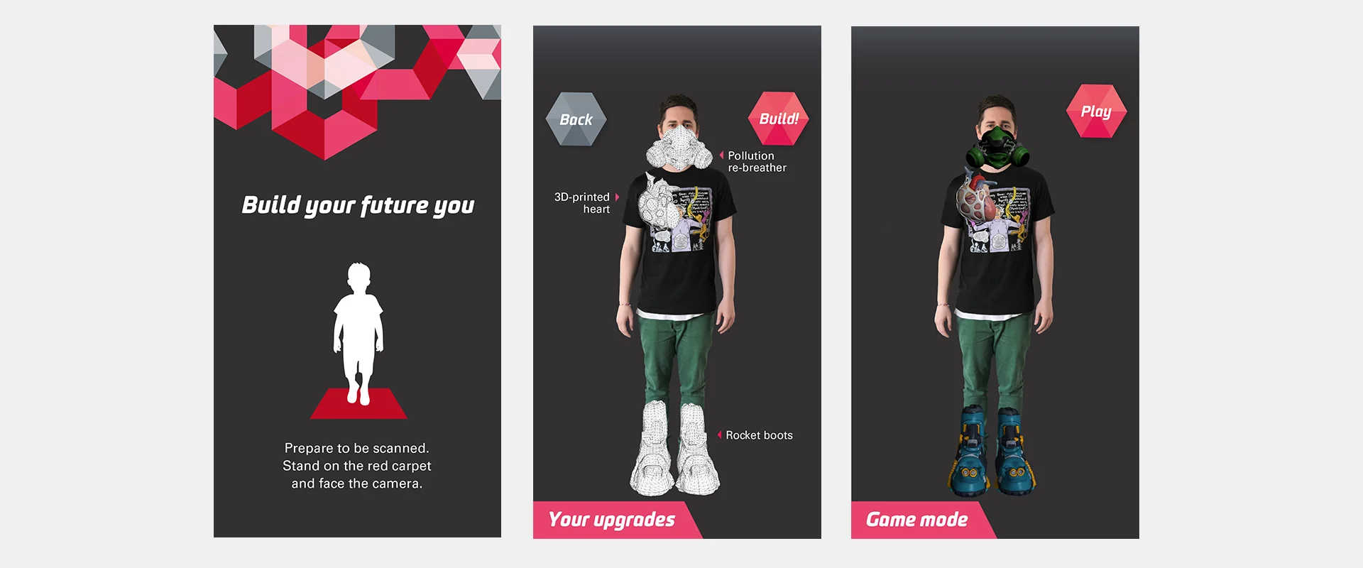 Visitors can try out rocket boots, wings, retractable hair, cybernetic brain implants, and over 25 other body enhancements. Once they have tested out their ideal selves and played a quick game, we capture an animated GIF of their experience for them to send on to their inboxes using an adjacent touchscreen.