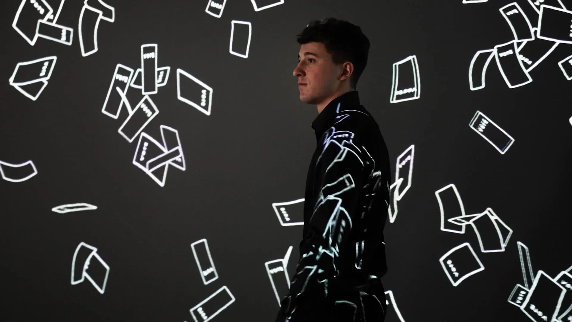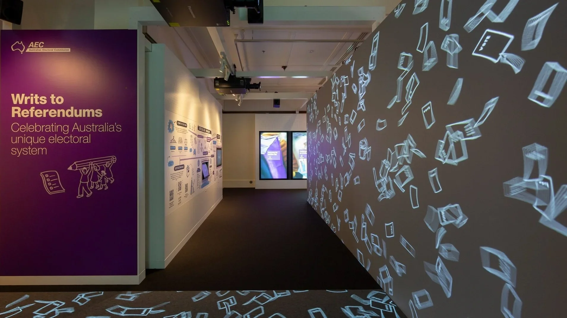 Visitors are greeted into the exhibition by flowing ballot papers moving across the floor and walls at the entrance. Motion-sensing cameras allow visitors to move the ballots, while an ambient soundscape creates the atmosphere of an election.