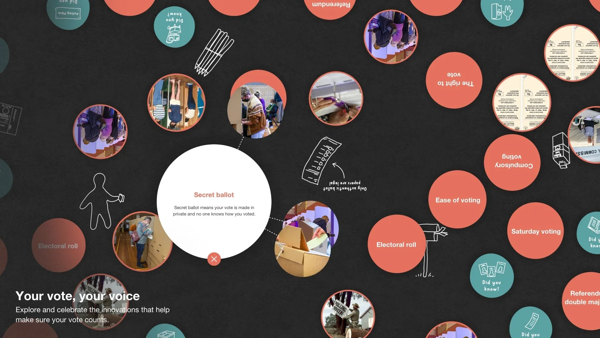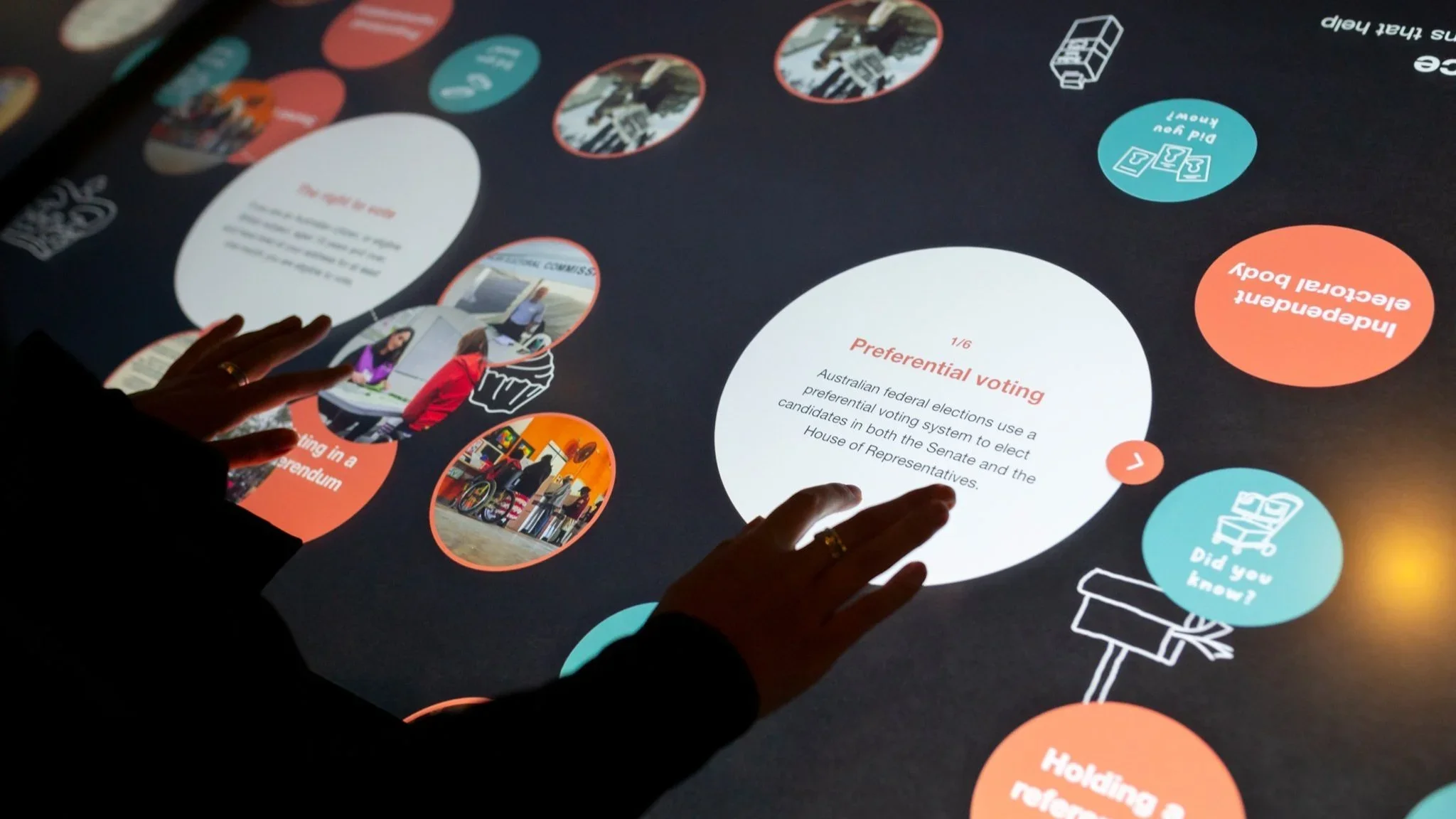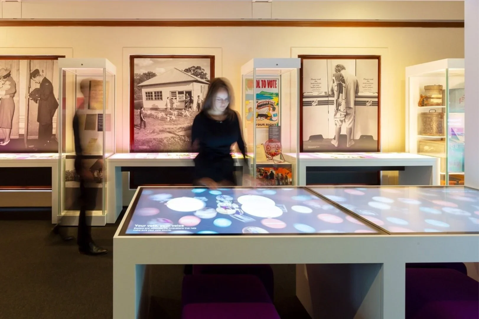 Two touchscreen interactives also allow visitors to explore the unique nature of Australia’s electoral system. Visitors can discover images, facts, videos, explore animations, or test their knowledge of Australian elections.
